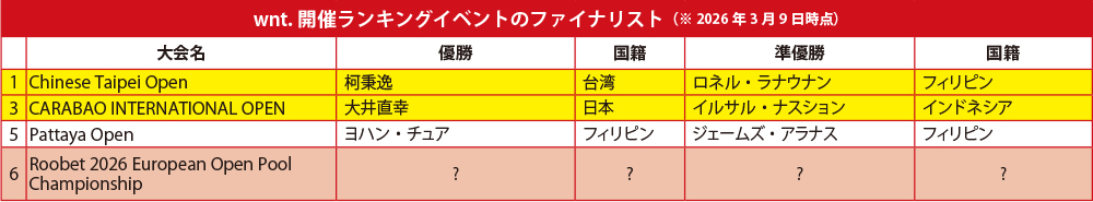 ただし、今回はワールドプール最強国のフィリピンから1人、それに次ぐ層の厚さを誇る台湾からの参戦はゼロとなっている。これは恐らく、wnt.だけでなくWPA/PBSやその他のプロモートによるアジア圏でのトーナメント数と賞金額がともに増加傾向にあるため、渡航費、滞在費等が負担となるヨーロッパ遠征をスキップする選択を取っていることが一つの要因と考えられる。