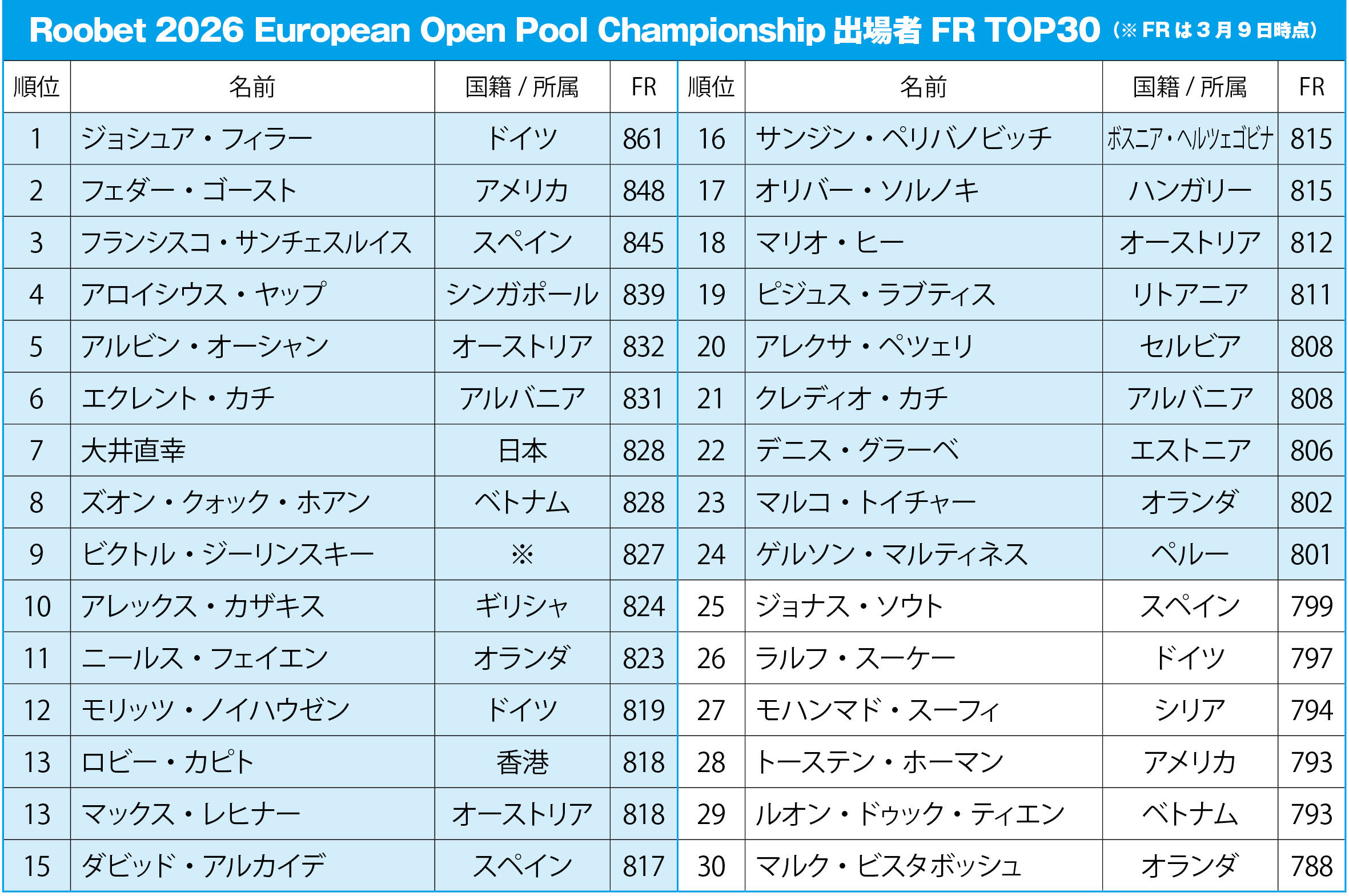 2026年シーズンに入り、台湾、インドネシア、タイとアジアでランキングイベント3戦を行ってきたwnt.、今年初となるメジャーイベントとなる『Roobet 2026 European Open Pool Championship』(ヨーロピアンオープン)が、ボスニア・ヘルツェゴヴィナの首都サラエボを舞台に現地10日(火)にスタートする。