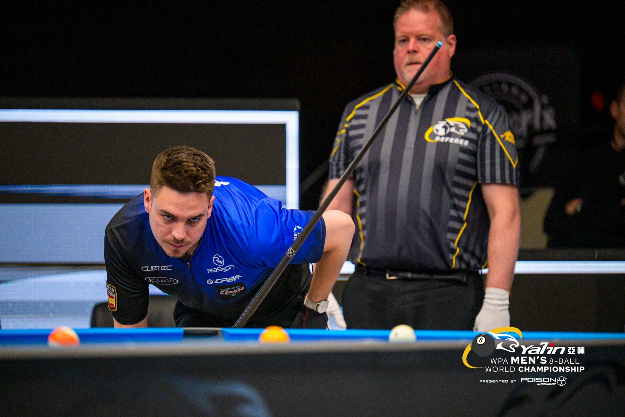 引き続きイベントのファイナルマッチとして行われた男子エイトボール世界選手権決勝、2022年以来となる2度目の優勝を目指すサンチェスルイスと、wnt.メジャータイトルを多数獲得しているものの、WPA公認の世界選手権にはまだ勝利していないヤップによる10ラック先取の戦いは、サンチェスルイスのノーインから素晴らしい取り切りを見せたヤップが先制。