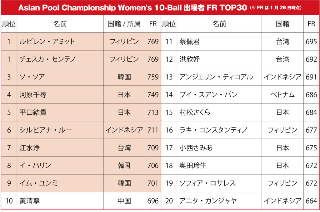 JPBA女子6名参戦の世界ナインボール選手権、出場64選手が決定