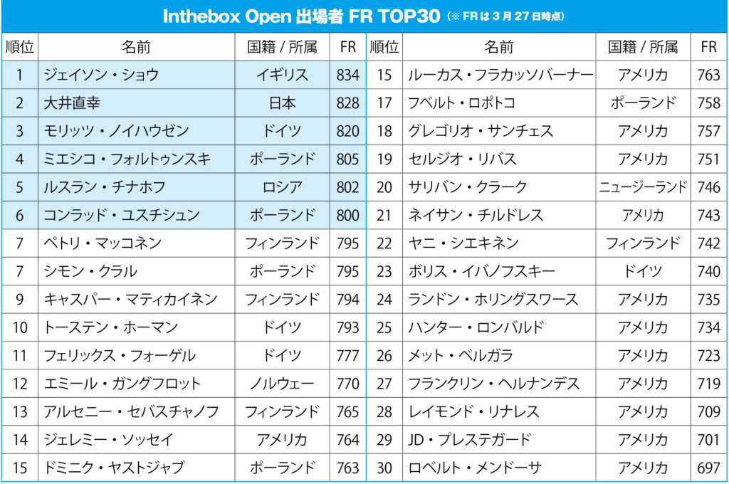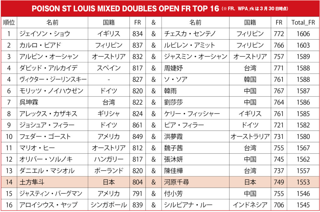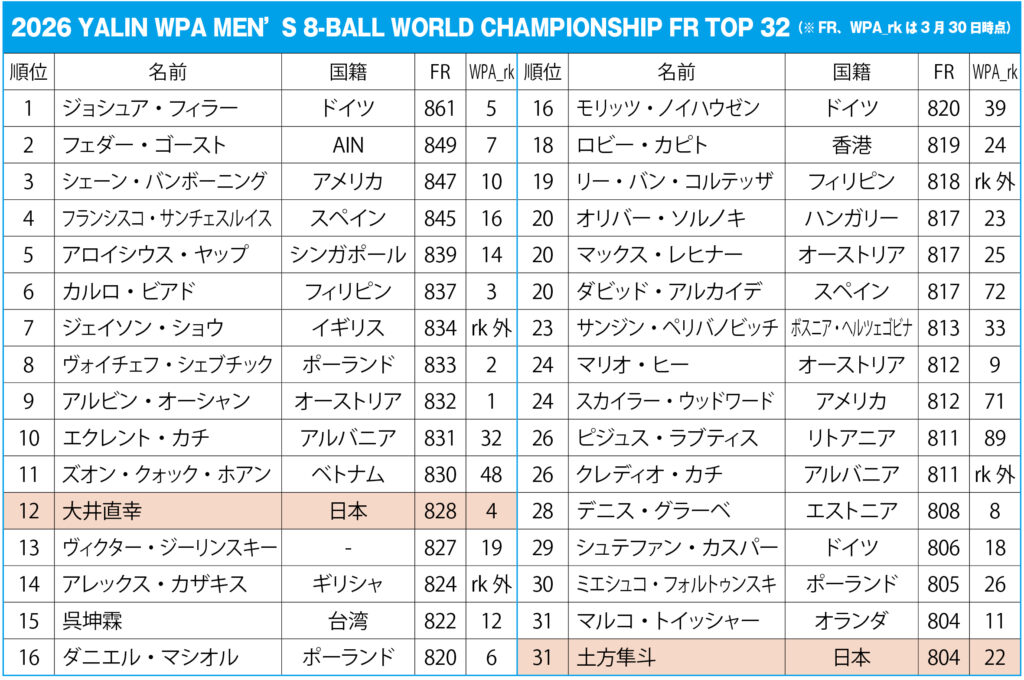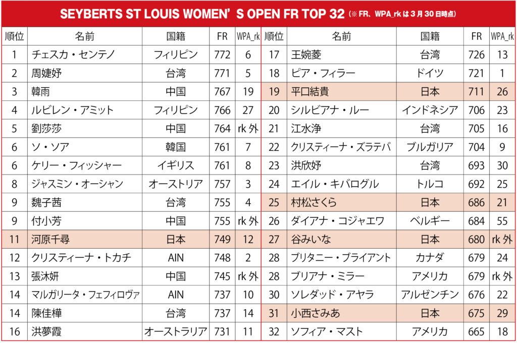 WPAランキング戦、日本勢の戦いが終了